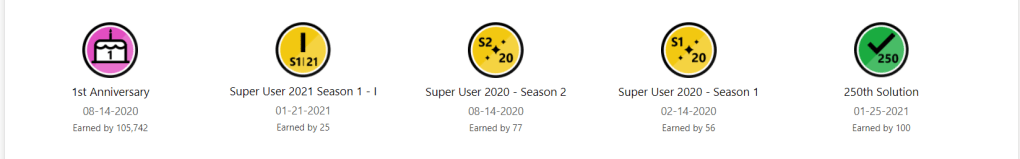 As you can see, the 150th solution has been earned by only 71 people as of this posting. Consider that over 60,000 people have replied on this forum at least once. The 150th Solution is the highest badge available for solutions. I am over 260 accepted solutions. Most recently I have been awarded the Super User 2020 – Season 1 badge at the highest level, which out of 56 Super Users, only 9 earned the Level IV designation.